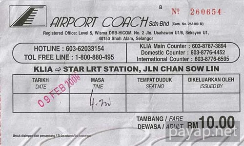 KLIA(Kuala Lumpur International Airport)から市内のChan Sow Linまで10M$。降りた目の前がStarLrt駅でした。