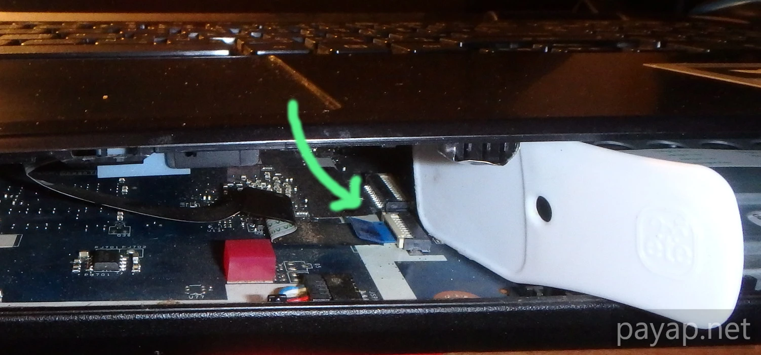 キーボードを外す前に外すケーブルは3か所、最初は少しだけキーボードを持ち上げて右側のケーブルを外す、その後に左奥と右奥のケーブルを外す。
