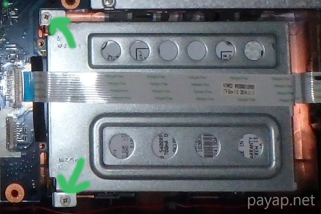 2か所のネジを外し、ケーブルを外せばハードディスクを外せる。